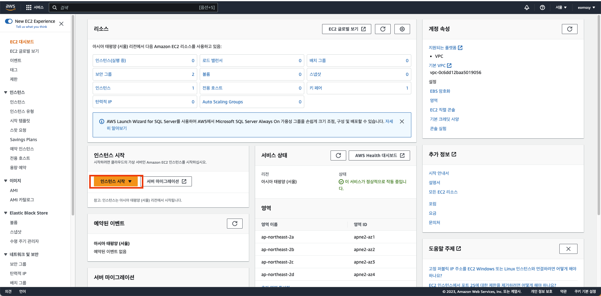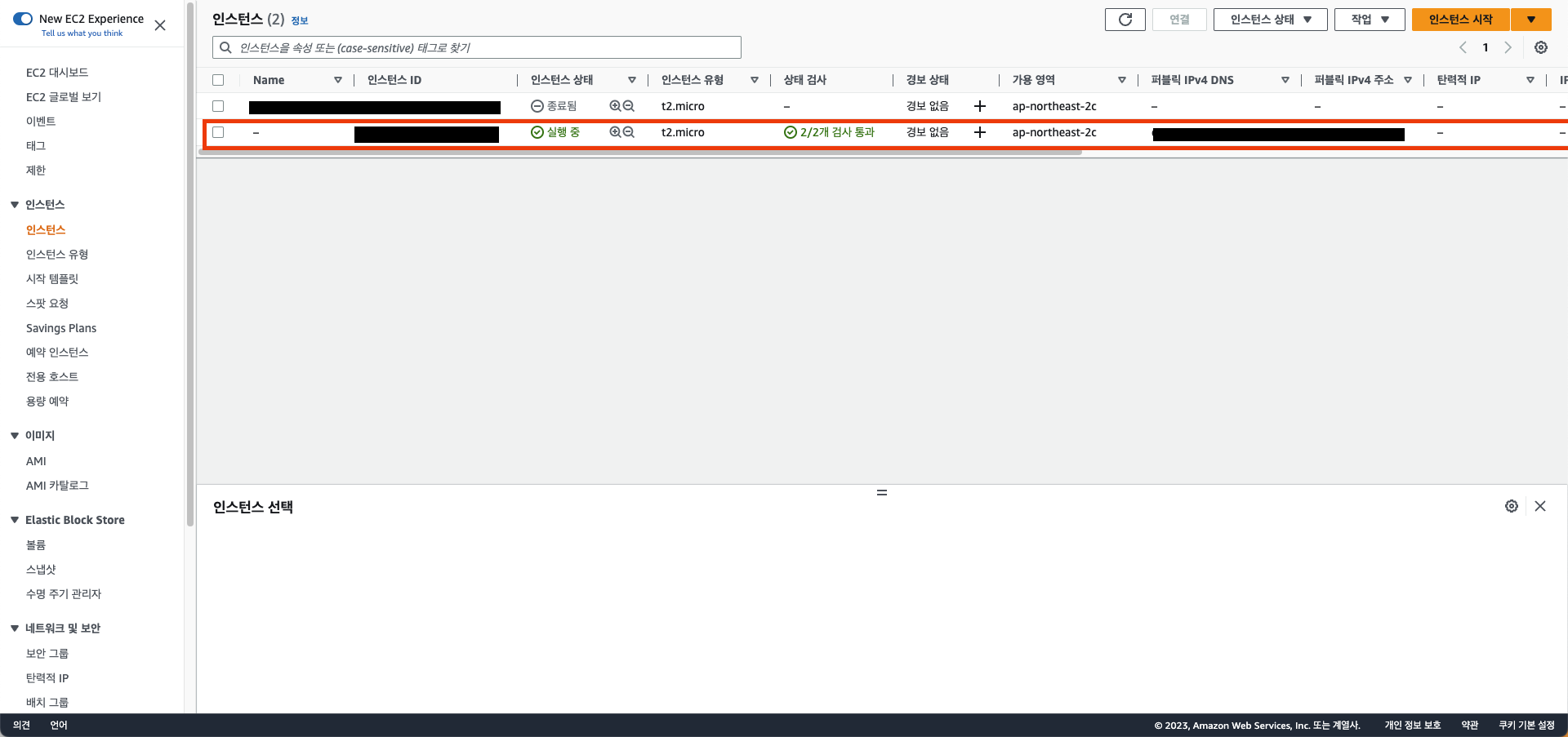 이후 인스턴스 시작 버튼을 클릭하면 인스턴스가 실행된다. 아래를 보면 다음과 같이 인스턴스가 실행 중인 것을 확인할 수 있다.