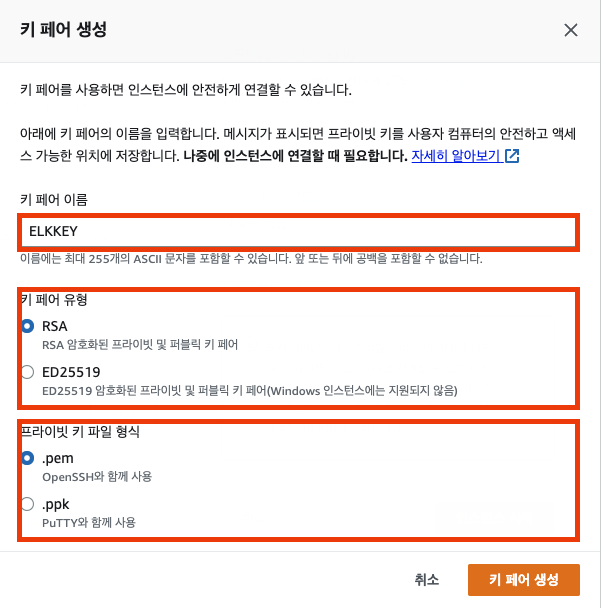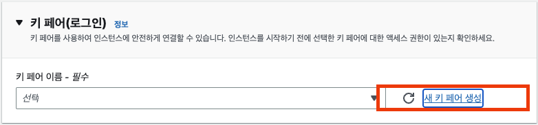 이후 키 페어를 생성한다. 키페어를 사용하여 로컬에서 SSH 등을 사용하여 인스턴스에 접속할 수 있다. 기존에 인스턴스를 생성한 적이 있는 경우, 해당 키 페어를 사용할 수 있다. 없는 경우에는 새 키 페어 생성 버튼을 클릭해서 키 페어를 생성한다. 해당 키페 어는 생성 후 분실하면 재발급 및 SSH로 인스턴스 접근이 어려우니, 반드시 잘 저장시켜야 한다. 이후 키페어 이름이나 유형, 프라이빗 파일 형식은 본인이 원하는 유형을 선택해서 만들면 된다.