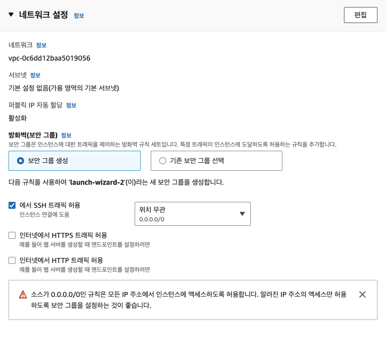 이후 네트워크 설정이다. 네트워크 설정은 EC2 인스턴스에 대한 방화벽 설정 IP 할당 VPC를 사용한다면 VPC 설정 및 서브넷등을 설정하는 구간인데 다음에 VPC에 대해서 자세하게 다뤄보겠다. 지금은 AWS 계정을 발급받으면 기본적으로 생성되어있는 Default VPC를 선택했다.