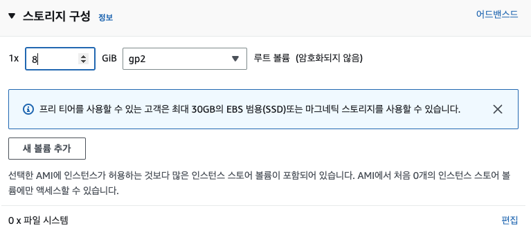이후 마지막으로 스토리지를 구성한다. EBS는 인스턴스에 할당된 저장소의 크기라고 보면 된다.(HDD, SSD등 본인이 원하는 유형을 선택할 수 있다) 기본 Default는 8GB로 나와있으나, 본인이 원하는 만큼 올릴 수 있고, 프리티어의 경우 최대 30GB까지 사용가능하다. EBS는 용량과 볼륨 유형등에 따라서 비용이 나온다.