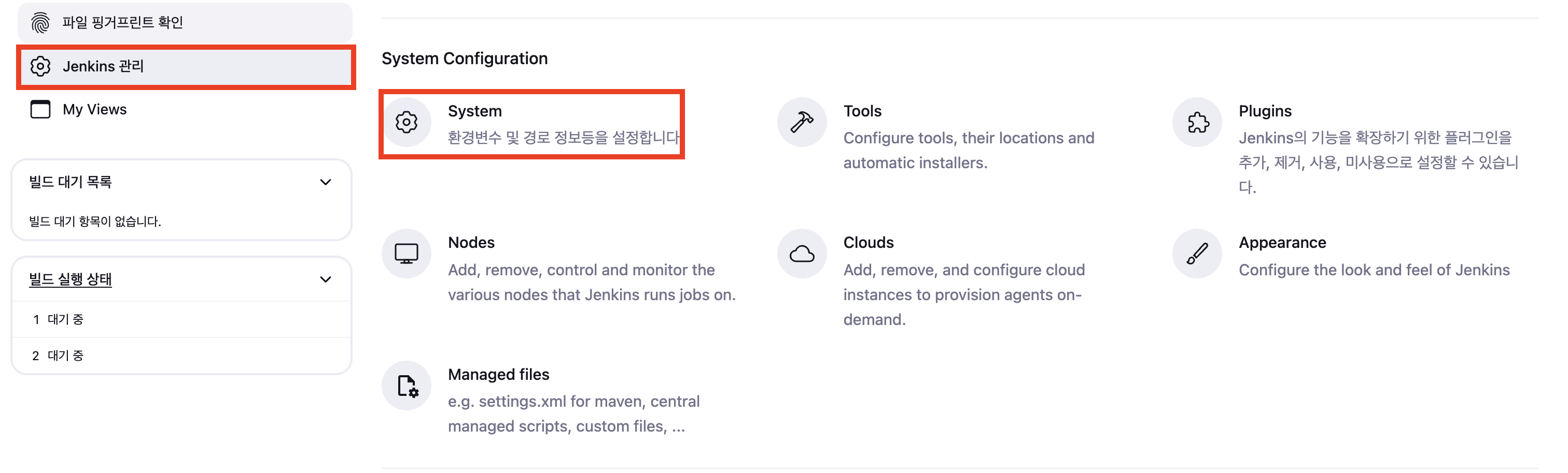 Jenkins 관리 탭에서 System 설정으로 접근한다.
