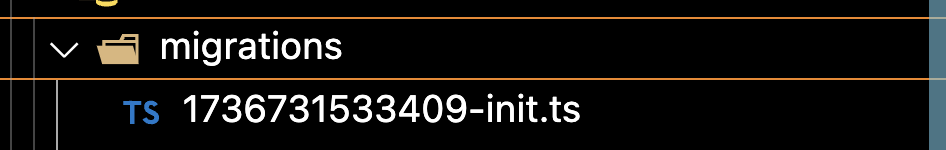 generate 명령어가 정상적으로 실행되면, 아래와 같이 migrations 파일이 생성된다. 파일명은 현재 시간의 타임스탬프(UNIX 시간)를 기준으로 생성되며, 이를 통해 마이그레이션이 실행되는 순서를 보장한다.